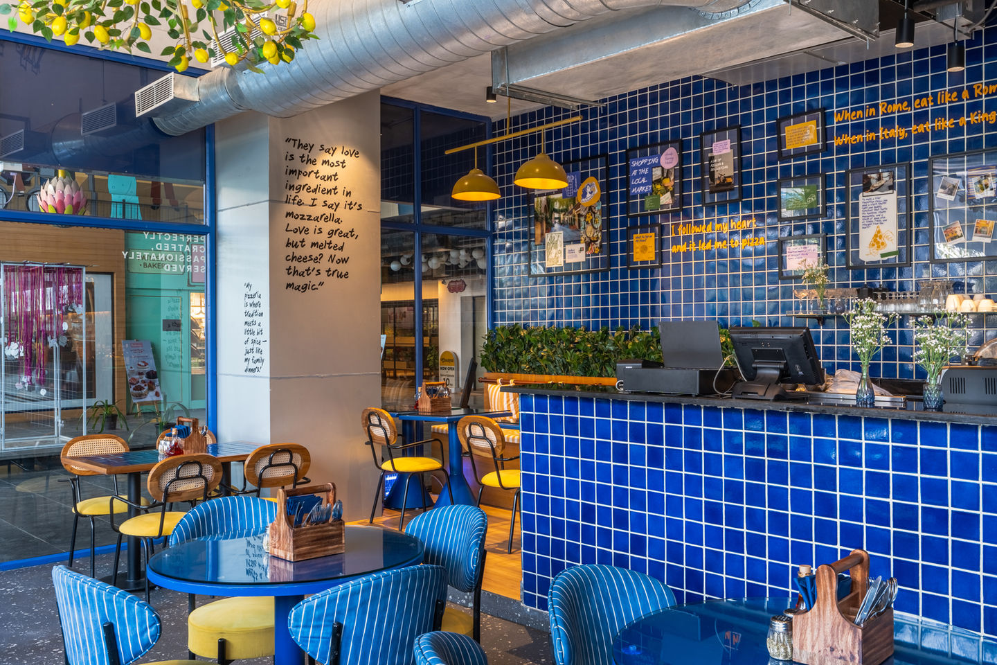 Studio ADi’s approach balances vibrancy with intimacy. The palette of ocean blue, lemon yellow, and natural rattan evokes the cheerful simplicity of an Italian trattoria, while the modern detailing keeps the space crisp and current. Upholstered chairs in blue pinstripes and mustard velvet, terrazzo flooring, and playful lemon chandeliers infuse character without clutter. Every texture — from glass to tile to wicker — harmonizes in a choreography of light and color.